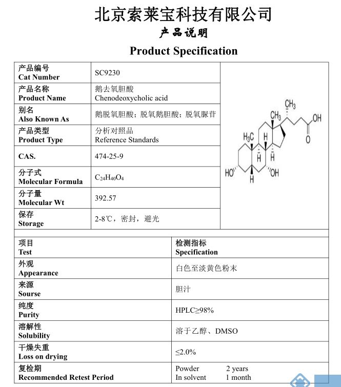 产品名称: Chenodeoxycholic acid;鹅去氧胆酸